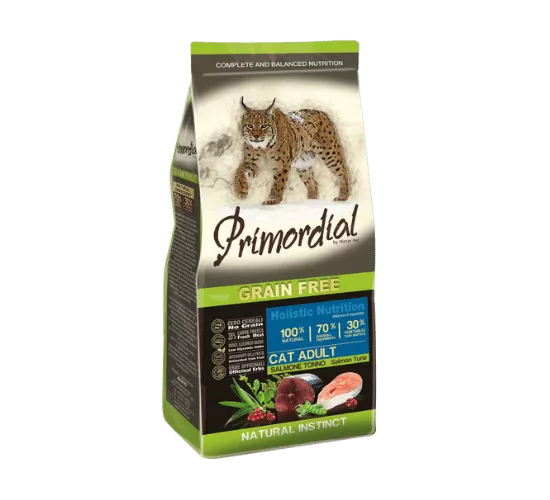 פרימורדיאל סלמון וטונה הוא מזון ללא דגנים, מלא ומאוזן עשיר בחלבונים בעלי ערך ביולוגי גבוה והרכב חומצות האמינו הדרוש.